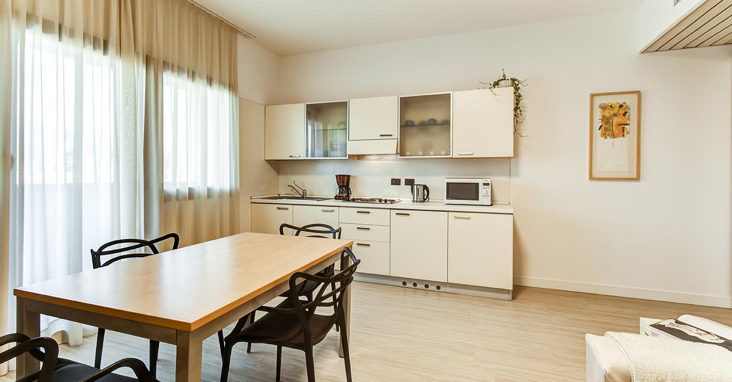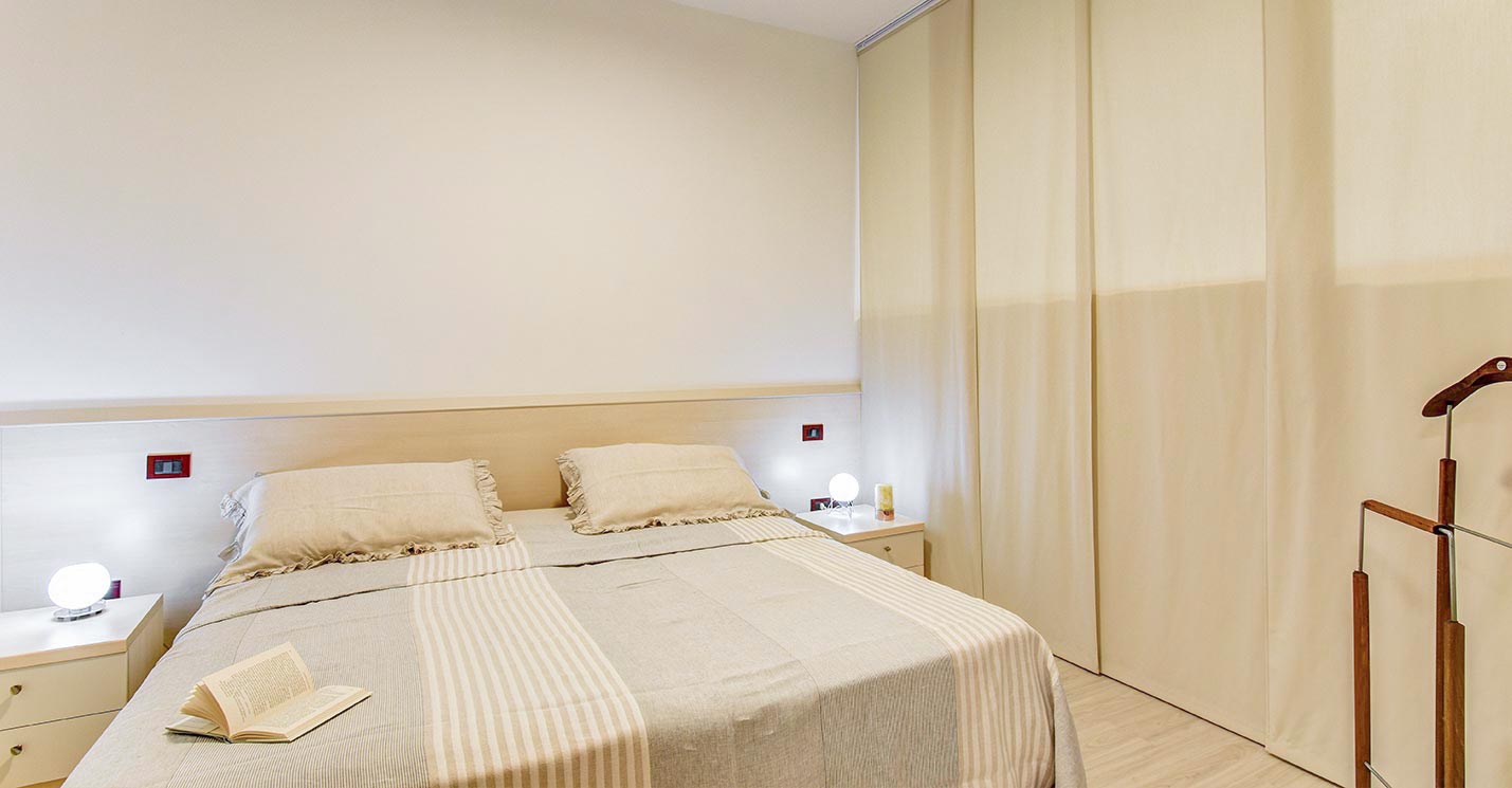 La camera, con parquet, ha un letto matrimoniale o due letti singoli, completi di biancheria. Il bagno è dotato di doccia o vasca, asciugacapelli e biancheria. Ogni appartamento del residence è dotato di: TV satellitare, aria condizionata, collegamento Wi-Fi, cassetta di sicurezza, videocitofono, lavatrice e stendibiancheria.
