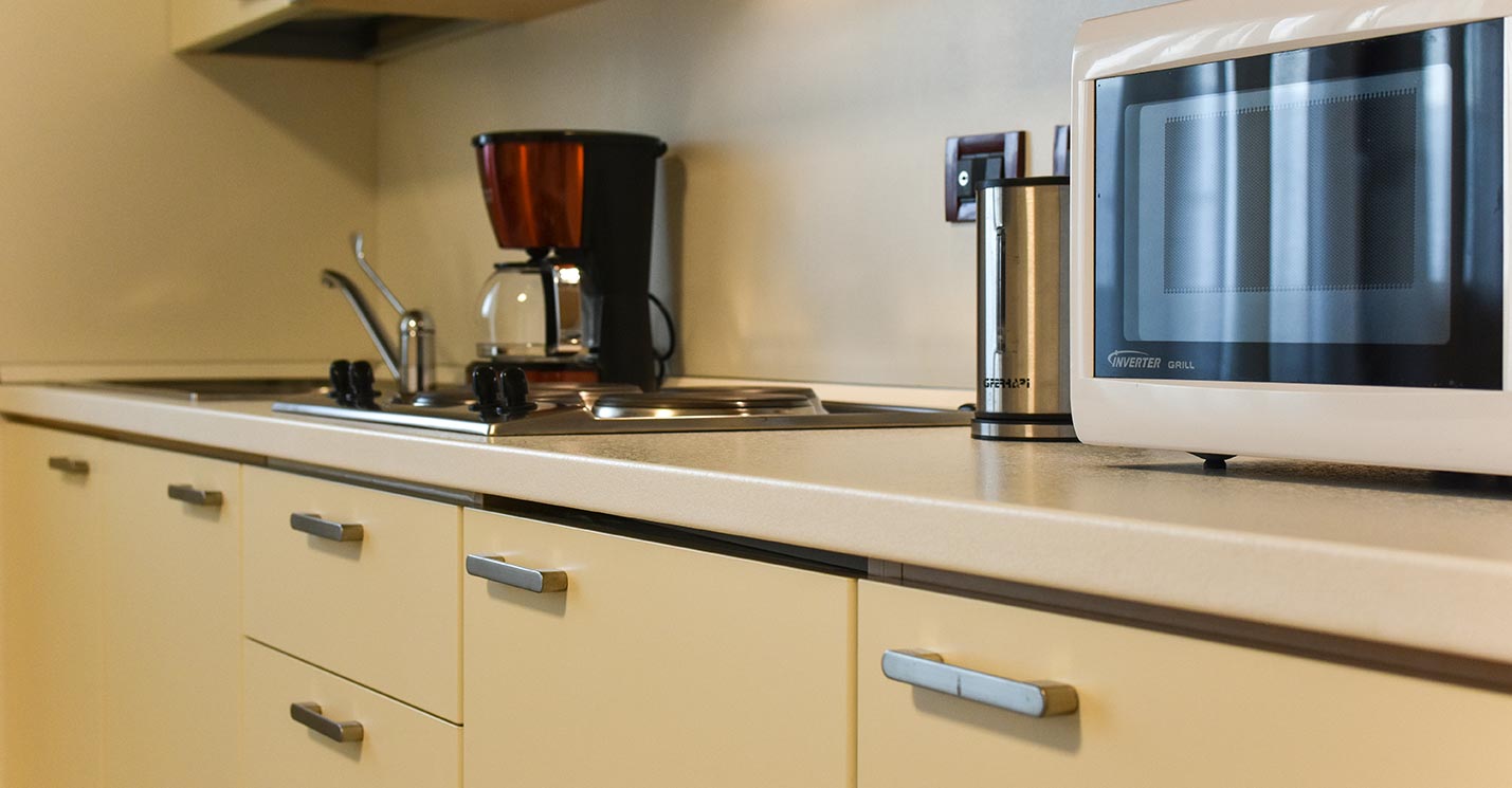 - Cucina privata attrezzata con pentole, stoviglie, forno a microonde, fornelli elettrici, frigorifero.