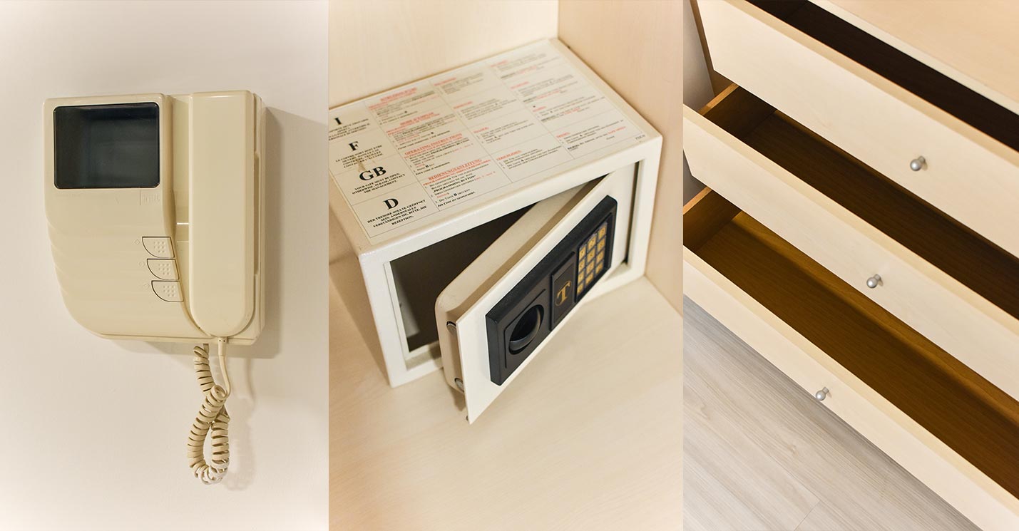 The bedroom has a wooden floor and can be set with double bed or two single beds, with linen. The bathroom has a shower or bathtub, hairdryer and towels. Each apartment of the residence is equipped with: satellite TV, air conditioning, Wi-Fi connection, safe, video intercom, washing machine and clothesline.